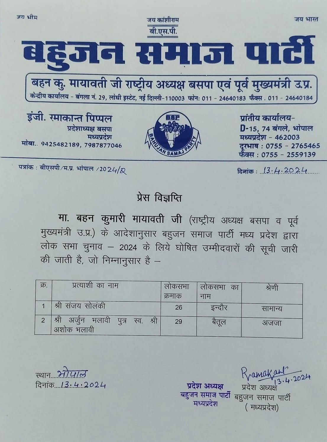 बहुजन समाज पार्टी ने बैतूल और इंदौर सीट पर प्रत्याशी के नाम का एलान कर दिया है। इंदौर में पार्टी ने संजय सोलंकी को प्रत्याशी बनाया है। वहीं, बैतूल में अर्जुन भलावी को उम्मीदवार बनाया है। अर्जुन भलावी अशोक भलावी के बेटे हैं। बसपा ने अशोक भलावी को अपना प्रत्याशी बनाया था, लेकिन नौ अप्रैल को उनकी हार्ट अटैक से मौत हो गई थी, जिसके बाद 10 अप्रैल को चुनाव आयोग ने निर्वाचन प्रक्रिया स्थगित कर संशोधित कार्यक्रम जारी किया। बैतूल में अब सात मई को तीसरे चरण में मतदान होगा।