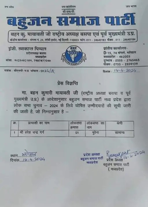 मुरैना के प्रतिष्ठित व्यवसाई एवं केएस ऑयल मिल के संचालक रमेश चंद्र गर्ग को बहुजन समाज पार्टी ने मुरैना श्योपुर संसदीय क्षेत्र से लोकसभा चुनाव का प्रत्याशी बनाया है। उनकी घोषणा पार्टी ने रविवार को कर दी है। रमेश गर्ग की पहचान अंचल के सबसे प्रतिष्ठित उद्योगपतियों में की जाती है। वह मुरैना के केएस ऑयल मिल के संचालक हैं और लंबे समय से मुरैना की राजनीति से जुड़े हुए हैं।