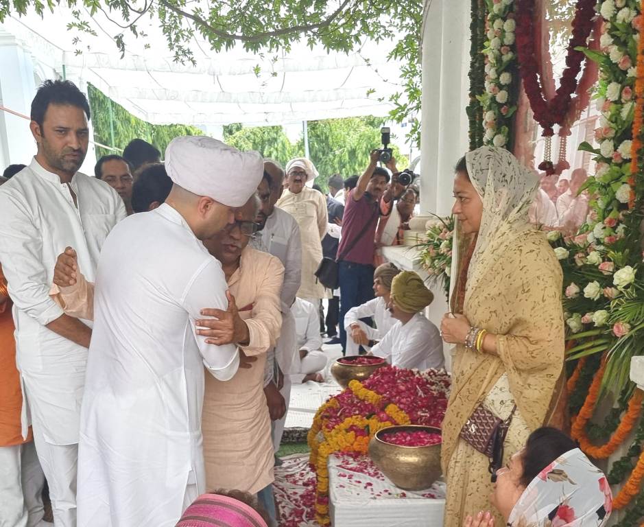 केन्द्रीय मंत्री ज्योतिरादित्य सिंधिया की मां राजमाता माधवीराजे के निधन के बाद अब महल में श्रद्धांजलि देने वालों का सैलाब उमड़ रहा है। गत रोज जहां एमपी के डिप्टी सीएम जगदीश देवड़ा, राजस्थान की डिप्टी सीएम दीया कुमारी, केन्द्रीय मंत्री एसपीएस बघेल, विधायक डा. सतीश सिकरवार सहित तमाम राजनीतिक एवं सामाजिक हस्तियों ने पहुंचकर राजमाता को श्रद्धांजलि दी थी। वहीं रविवार को प्रदेश भाजपा के पूर्व अध्यक्ष एवं पूर्व राज्यसभा सदस्य प्रभात भी महल पहुंचे और स्व. राजमाता को अपनी विनम्र श्रद्धांजलि अर्पित कर उनके सुपुत्र ज्योतिरादित्य को ढांढस बंधाया। श्री झा के साथ इस दौरान पूर्व प्रदेश मीडिया प्रमुख उदय अग्रवाल, ग्वालियर प्रभारी जीतू जीराती, भास्कर प्लस न्यूज पोर्टल के प्रधान संपादक धीरज राजकुमार बंसल, जिला महामंत्री राजू पलैया, जैमनी शर्मा आदि भी थे।