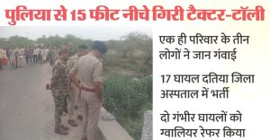 दतिया एसपी की ओर से जानकारी दी गई कि भांडेर थाना क्षेत्र के ग्राम कुरेथा और मैथाना- पाली की पुलिया के बीच ट्रैक्टर-ट्रॉली पलटने की सूचना पर तत्काल घटना स्थल पर पहुंच कर राहत और बचाव कार्य का जायजा लिया। घायलों को उपचार के लिए हॉस्पिटल भेजा है, चिकित्सकों को सभी घायलों के बेहतर इलाज के दिशा-निर्देश दिए हैं। जानकारी के अुनसार दीसवार गांव के करीब 200 लोगों एक साथ रतनगढ़ माता मंदिर पर जवारे चढ़ाने जा रहे थे। सभी छह ट्रैक्टर-ट्रॉली में सवार होकर एक साथ निकले थे। इस दौरान ग्राम कुरेथा और मैथाना-पाली की पुलिया पर एक ट्रैक्टर-ट्रॉली अनियंत्रित होकर करीब 15 फीट नीचे गिरकर पलट गया। हादसे में पांच लोगों की मौके पर ही मौत हो गई। मरने वालों में तीन लड़कियां और दो महिलाएं शामिल हैं। इनमें से दो लड़कियां और एक महिला एक ही परिवार की हैं। परिवार में एक साथ तीन लोगों की मौत से मातम पसर गया है। वहीं, हादसे से पूरे गांव में गमगीन माहौल है। हादसे की सूचना के बाद दतिया पुलिस अधीक्षक वीरेंद्र मिश्रा जिला अस्पताल पहुंचे और घायलों से मिलकर हादसे की जानकारी ली।। पुलिस के अनुसार हादसे में क्रांति (17) पिता नवल किशोर, कामनी (19) पिता नवर किशोर और सीमा (30) पत्नी नवल किशोर की मौत हो गई। ये तीनों एक ही परिवार की थी। इसके अलावा हादसे में रोशनी (17) पिता रमेश अहिरवार और सोनम (11) पिता चंदन अहिरवार की भी जांच चली गई।