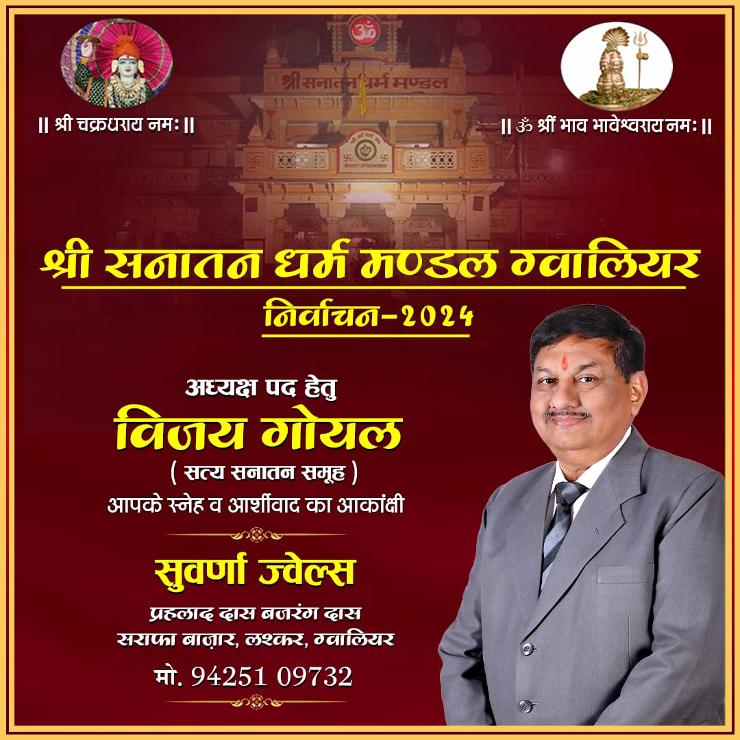भास्कर प्लास न्यूज पोर्टल ने सत्य सनातन समूह के वायदों पर प्रकाश डाला। समूह से अध्यक्ष पद पर प्रत्याशी विजय गोयल का कहना है कि सेवा-समर्पण एवं सद्भाव की भावना के साथ 2024 के निर्वाचन में समूह उतरा है। उनका कहना है कि समूह के प्रत्याशी का सेवा ही संकल्प है। मण्डल के किसी कार्य में जिनका कोई निजी स्वार्थ नहीं है सेवाभावी हैं, धार्मिक वृत्ति के हैं तथा हमेशा समाज कल्याण एवं समाज से उत्थान में योगदान देते रहे हैं। श्री गोयल ने कहा कि हम सुप्रतिष्ठित धार्मिक संस्था को उसके उच्चस्तर पर ले जाने के लिये दृढ़ संकल्पित है। श्री गोयल ने समूह की प्राथमिकतायें भी निगाई, जो इस प्रकार हैंः-