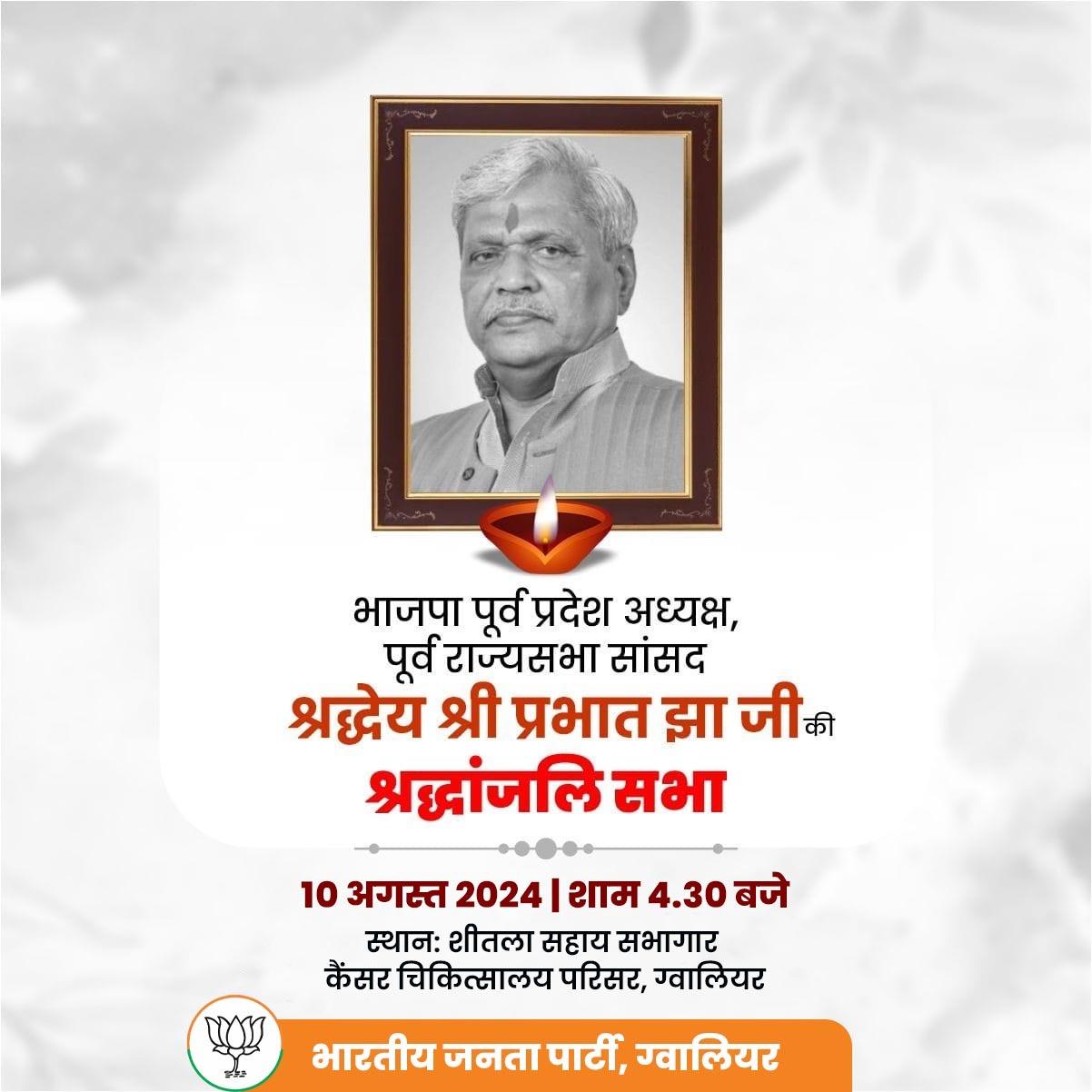 ग्वालियर। भाजपा पूर्व प्रदेश अध्यक्ष एवं पूर्व राज्यसभा सांसद प्रभात झा की श्रद्धांजलि सभा 10 अगस्त को आहूत की गई है। भाजपा जिलाध्यक्ष अभय चौधरी ने बताया कि श्रद्धांजलि सभा का आयोजन भारतीय जनता पार्टी ग्वालियर द्वारा किया गया है। श्रद्धांजलि साा शीतला सहाय सभागार कैंसर चिकित्सालय परिसर में शाम 4 बजे से होगी।