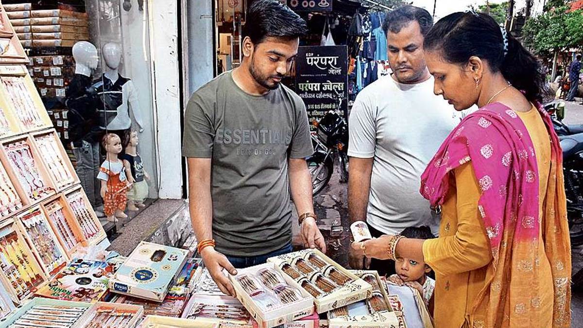 शहर के दौलतगंज में राखियों का बाजार सज गया है। यहां खरीदारी के लिए महिलाएं पहुंच रही हैं। दुकानदार उनकी मांग पूरी करने में व्यस्त हैं। युवाओं को स्लम राखियां भा रही हैं, इसलिए बहनें इन राखियों की खरीदारी ज्यादा कर रही हैं। इसके अलावा चंदन, तुलसी, मोती, ब्रेसलेट, ज्वैलरी, कोलकाता कढ़ाई, नजर बट्टू राखियों की मांग भी खूब है। दुकानदारों का कहना है कि वैरायटी बढ़ाई गई है। शिवलिंग, खाटू श्याम, राधा कृष्ण के साथ राधे-राधे, श्रीराम लिखी राखी भी बाजार में मौजूद है। दुकानदार ने बताया कि, मैं कई सालों से यहां दुकान लगाता हूं, लेकिन इस बार रक्षाबंधन की कई वैरायटी हम लोग लेकर आए हैं। ग्राहक की भी खूब डिमांड बढ़ रही है। इस बार रक्षाबंधन में वैसे तो सभी वैरायटी की राखियों की मांग है, लेकिन युवा की पसंद स्लम राखियां बनी हुई हैं।