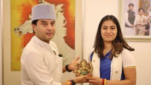 इस बार ओलंपिक में शूटिंग प्रतिस्पर्धा में दो मेडल जीतने वाली मनु भाकर से केंद्रीय मंत्री ज्योतिरादित्य सिंधिया ने शुक्रवार को मुलाकात की. मनु भाकर के साथ उनका पूरा परिवार भी इस दौरान मौजूद था. केंद्रीय मंत्री ज्योतिरादित्य सिंधिया ने मनु भाकर और सभी परिवार के सदस्यों का अभिवादन किया. केंद्रीय मंत्री ज्योतिरादित्य सिंधिया द्वारा मनु भाकर को धातु निर्मित विशेष गणपति की मूर्ति देकर मनु भाकर का अभिनंदन किया.