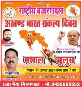 भोपाल। राष्ट्रीय बजरंग दल अखण्ड भारत संकल्प दिवस मना रहा है। महानगर अध्यक्ष कैलाश खेर ने बताया कि अखण्ड भारत संकल्प दिवस के तहत आगामी 14 अगस्त को मशाल जूलुस निकाला जायेगा। मशाल जूलुस 14 अगस्त को सायं 7 बजे से डीआईजी चैराहा भोपाल से प्रारंभ होगा। मशाल जूलुस में हिन्दू ह्रदय सम्राट डा. प्रवीण भाई तोगडिया एवं प्रांत अध्यक्ष कमलेश खेर उपस्थित रहेंगे।