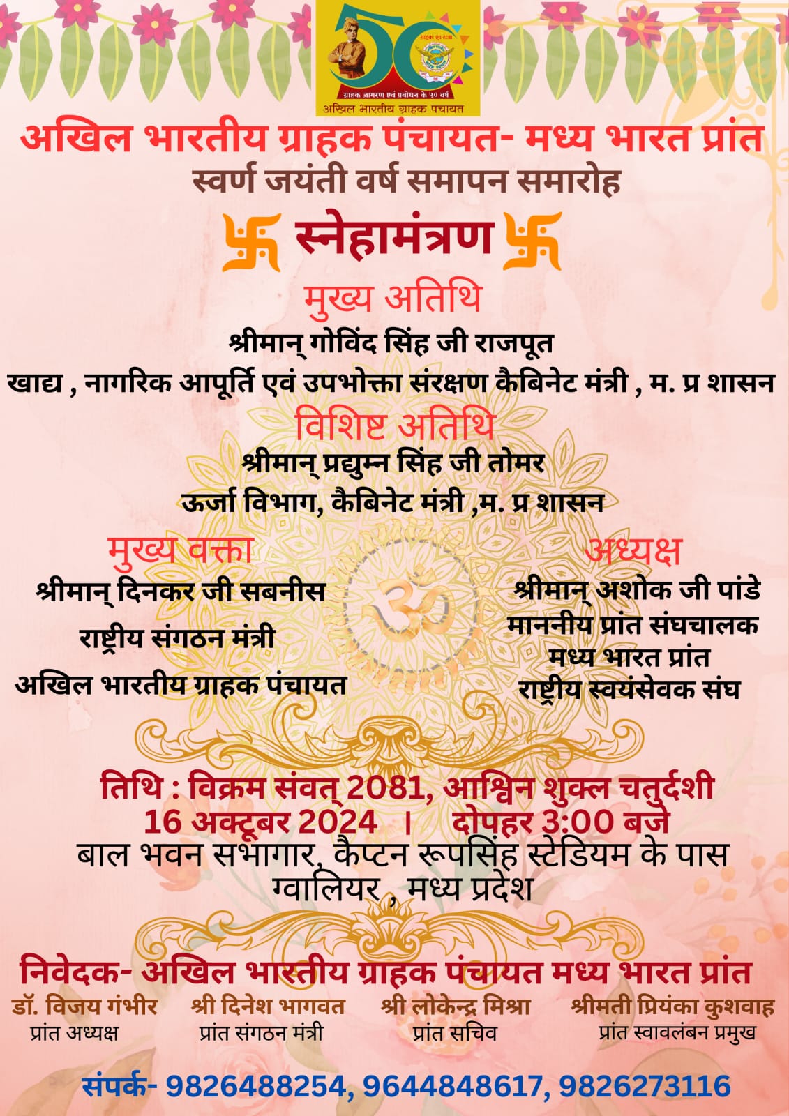 ग्वालियर। अखिल भारतीय ग्राहक पंचायत मध्य भारत प्रांत का स्वर्ण जयंती वर्ष समापन समारोह 16़ अक्टूबर को दोपहर 3 बजे से बाल भवन सभागार कैप्टन रूपसिंह स्टेडियम के पास आयोजित किया गया है। प्रांत अध्यक्ष डा. विजय गंभीर, प्रांत संगठन मंत्री दिनेश भागवत, प्रांत सचिव लोकेन्द्र मिश्रा एवं प्रांत स्वावलंबन प्रमुख श्रीमती प्रियंका कुशवाह ने बताया कि समारोह के मुख्य अतिथि खाघ, नागरिक आपूर्ति एवं उपभोक्ता संरक्षण मंत्री गोविंद सिंह राजपूत होंगे। जबकि विशिष्ट अतिथि उर्जा मंत्री प्रद्युम्न सिंह तोमर होंगे। कार्यक्रम में मुख्य वक्ता के रूप में राष्ट्रीय संगठन मंत्री ग्राहक पंचायत दिनकर सबनीस एवं अध्यक्ष के रूप में प्रांत संघचालक मध्य भारत प्रांत आरएसएस अशोक पांडे उपस्थित रहेंगे।
