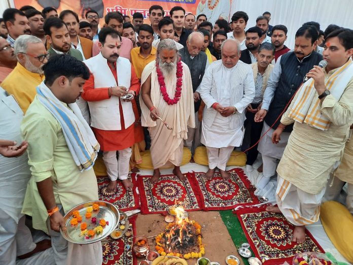 ग्वालियर। मां कनकेश्वरी देवी भक्ति योग वेदांत सेवा संघ ग्वालियर द्वारा मानस मर्मज्ञ प्रवक्ता,परम पूज्य संत मां कनकेश्वरी देवी जी के मुखारबिंद से ग्वालियर में नौ दिवसीय श्रीमद् देवी भागवत कथा का आयोजन रामलीला मैदान मुरार में होने जा रहा है। ग्वालियर में एक बार फिर साध्वी और जानी-मानी कथा वाचक मां कनकेश्वरी देवी भक्तों को आशीर्वाद देंगी। दंदरौआ धाम के महंत रामदास महाराज के मुख्य आतिथ्य में मुरार के रामलीला मैदान में श्रीमद् देवी भागवत कथा के लिए विधि विधान और पूजा अर्चना के साथ भूमि पूजन संपन्न हुआ। इस मौके पर कथा के मुख्य यजमान मध्य प्रदेश विधानसभा के अध्यक्ष नरेंद्र सिंह तोमर, देवेंद्र प्रताप सिंह तोमर रामू और प्रबल प्रताप सिंह तोमर भी विशेष रूप से उपस्थित रहे।