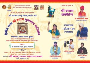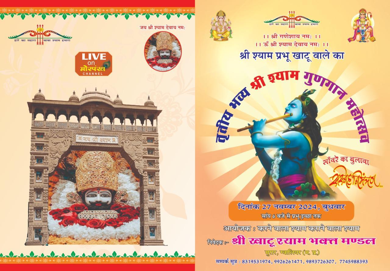 ग्वालियर। श्री खाटूश्याम भक्त मण्डल मुरार द्वारा तृतीय भव्य श्री श्याम गुणगान महोत्सव का आयोजन 27 नवंबर को किया गया है। यह आयोजन श्री रामलीला मैदान मुरार में सायं 6 बजे से शुरू होगा। कार्यक्रम में दीक्षा शर्मा आगरा, बन्टी सरदार नानपाराधाम, लक्षित वाजपेई लखनउ, दिव्यांश बालाजी ग्वालियर एवं मास्टर वीरेन्द्र ग्वालियर श्याम भजनों की प्रस्तुति देंगे।