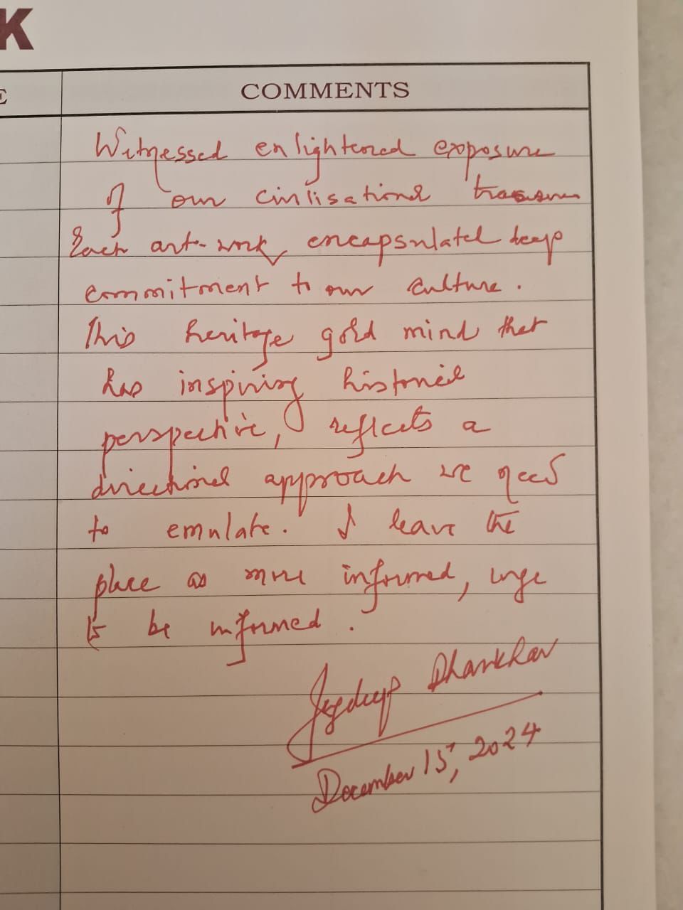 महल दौरे से पहले उपराष्ट्रपति और उनकी धर्मपत्नी ने सिंधिया परिवार के साथ दोपहर का भोजन किया। इस सादगीपूर्ण भोज में नेपाली और मराठी व्यंजनों का विशेष स्वाद परोसा गया। व्यंजनों में नेपाली आलू, बड़ौदा पुलाव, सोल कड़ी, कुरकुरी भिंडी, लौकी कोफ्ता कड़ी और श्रीखंड शामिल थे। भोजन के दौरान गर्मजोशी से स्वागत करते हुए केंद्रीय मंत्री सिंधिया ने अपने महल के इतिहास और संस्कृति पर चर्चा की। महल की सांस्कृतिक धरोहर से प्रभावित होकर उपराष्ट्रपति ने विजिटर बुक में अंग्रेजी में एक भावपूर्ण संदेश लिखा। उन्होंने लिखा कि हमारी सभ्यता के खजाने का प्रबुद्ध प्रदर्शन देखा। प्रत्येक कलाकृति हमारी संस्कृति के प्रति गहरी प्रतिबद्धता को दर्शाती है। यह विरासत सोने की खान है, जो ऐतिहासिक परिप्रेक्ष्य को प्रेरित करती है और दिशात्मक दृष्टिकोण को दर्शाती है, जिसका हम अनुकरण करने की उम्मीद करते हैं। मैं महल से अधिक जानकारी के साथ जा रहा हूं और जानकारी प्राप्त करने का आग्रह करता हूं।