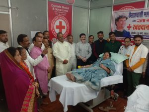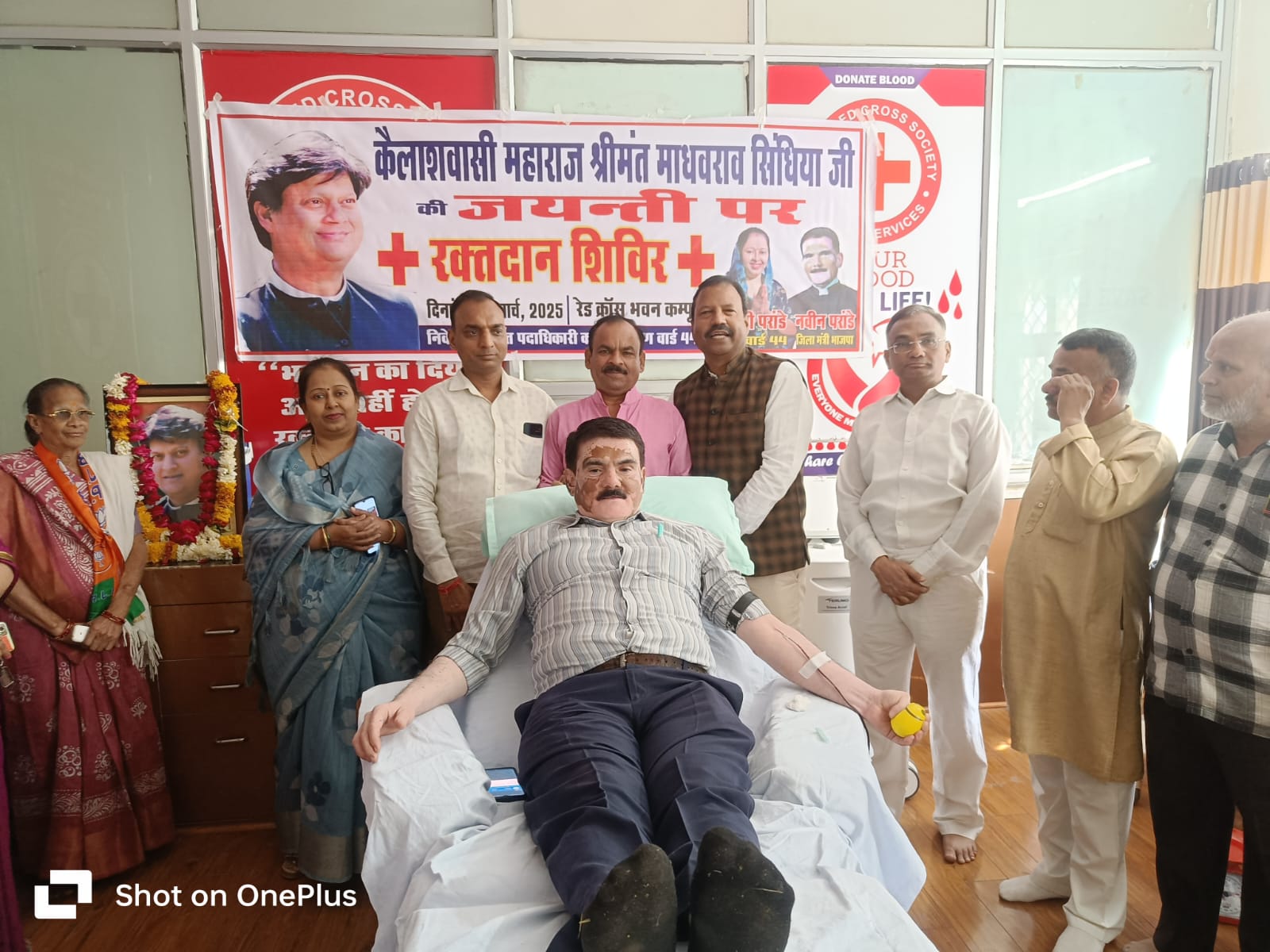 ग्वालियर। कै. महाराज माधवराव सिंधिया की जयंती पर सोमवार को रक्तदान शिविर का आयोजन किया गया। कै. सिंधिया की सोमवार को 80वीं जन्म जयंती है। इस उपलक्ष्य में सुबह 10 बजे से एक रक्तदान शिविर का आयोजन भाजपा पार्षद यामिनी परांडे, जिला मंत्री भा.ज.पा. नवीन परांडे की देखरेख में हुआ। शिविर का शुभारंभ प्रदेश के केबिनेट मंत्री नारायण सिंह कुशवाह ने कै. महाराज के चित्र पर माल्यार्पण कर किया। इस मौके पर पूर्व विधायक रमेश अग्रवाल सहित वरिष्ठ नेता धीरज राजकुमार बंसल, नरेन्द्र सिंह पवैया, महेन्द्र सोलंकी, राजू भाई, श्रीमती जयंती पाल आदि उपस्थित थे। शिविर में लगभग 20 यूनिट रक्त का संग्रह हुआ। कार्यक्रम में वार्ड 44 के कार्यकर्ताओं की सहभागिता रही।