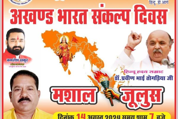 भोपाल। राष्ट्रीय बजरंग दल अखण्ड भारत संकल्प दिवस मना रहा है। महानगर अध्यक्ष कैलाश खेर ने बताया कि अखण्ड भारत संकल्प दिवस के तहत आगामी 14 अगस्त को मशाल जूलुस निकाला जायेगा। मशाल जूलुस 14 अगस्त को सायं 7 बजे से डीआईजी चैराहा भोपाल से प्रारंभ होगा। मशाल जूलुस में हिन्दू ह्रदय सम्राट डा. प्रवीण…
