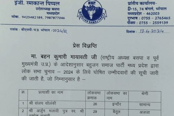 BSP ने 2 सीटों पर घोषित किए प्रत्याशी, बैतूल से उतारा नया चेहरा